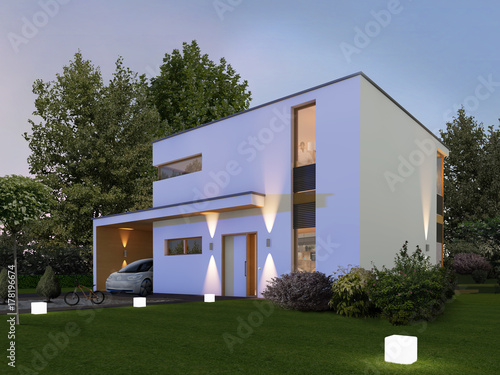 Haus Kubus 1 In Der Nacht Mit Carport Und Elektroauto Ausschnitt